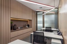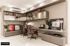 A cor é extremamente adaptável e combina com estilos que estão em evidência, como o escandinavo, minimalista, boho e até o industrial, trazendo uma suavidade que equilibra o ambiente. O projeto do escritório desenvolvido por Flávia Pereira conta com acabamentos de portas e painéis que criam um visual aconchegante e contemporâneo.
