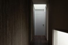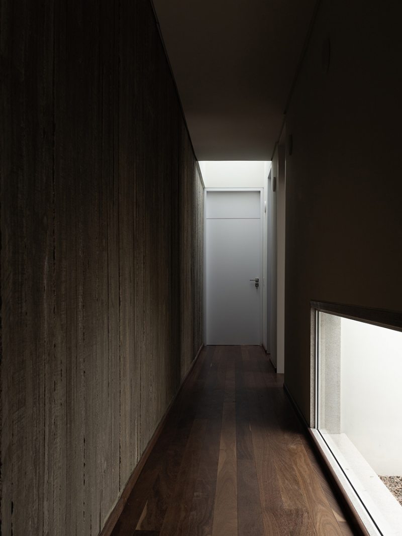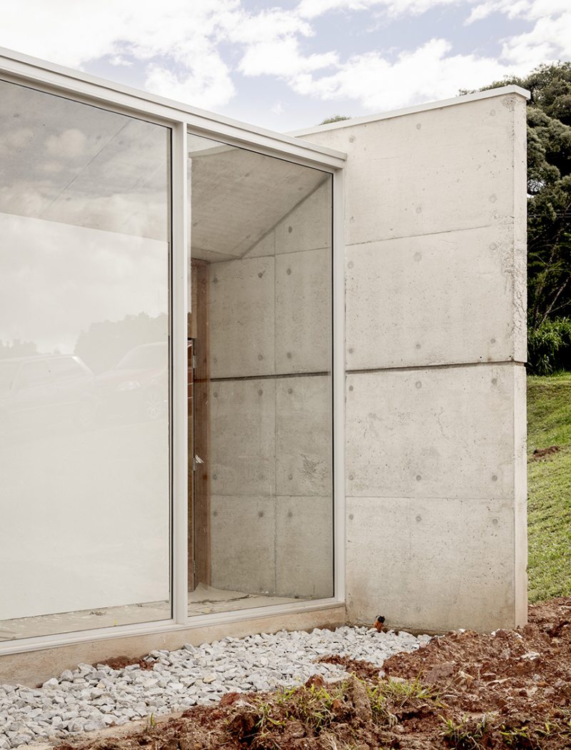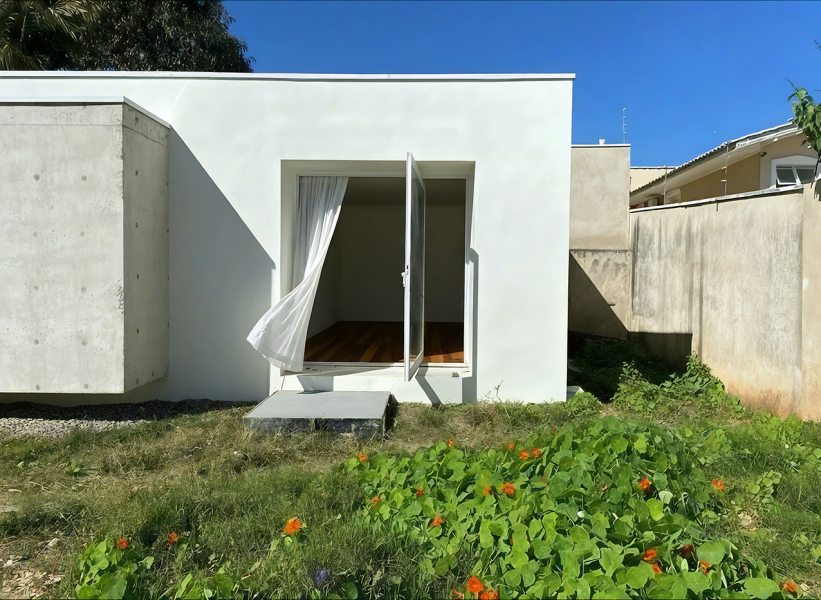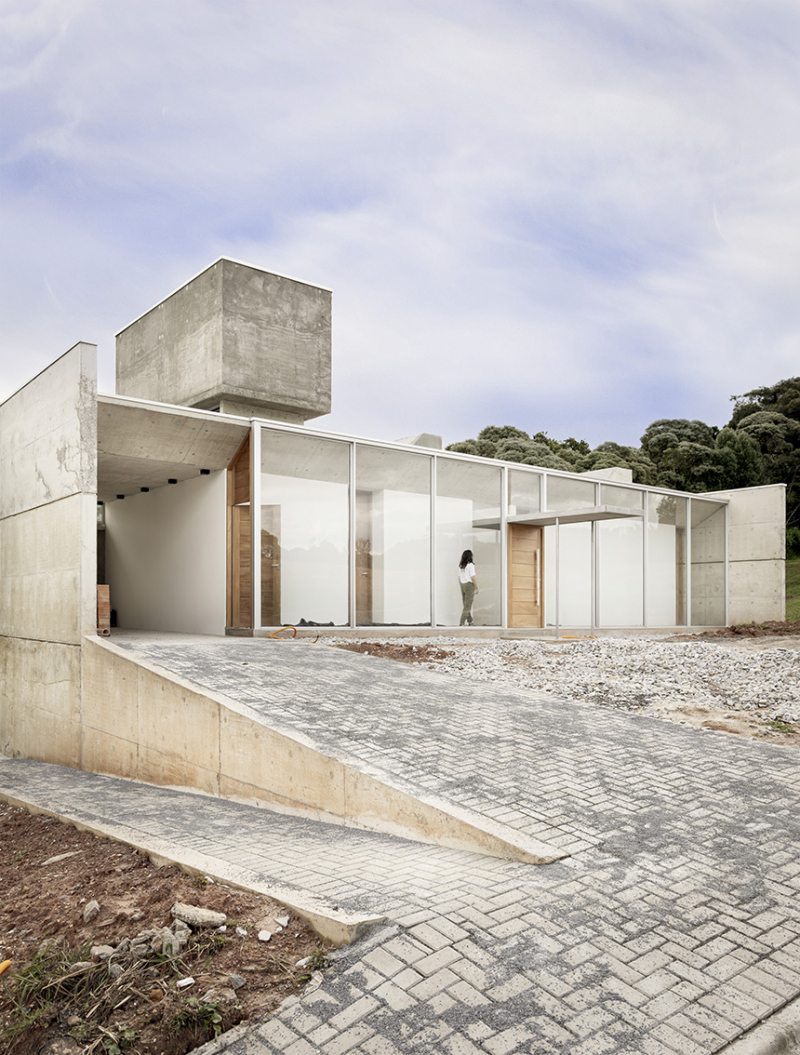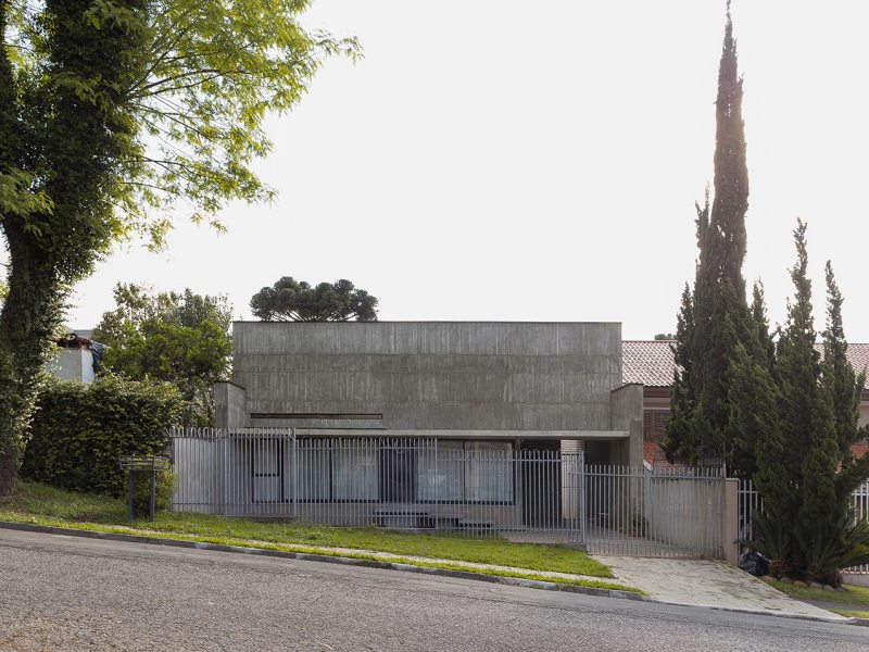 Na Casa Angélica, em um lote urbano em Curitiba, a arquitetura opera através de dualidades. A volumetria frontal é definida por uma membrana externa de concreto cru em que a textura ripada aparenta uma armadura invulnerável voltada para a rua. Esta dureza externa, no entanto, é o que garante a preservação de um interior etéreo e fluido.