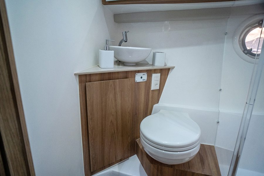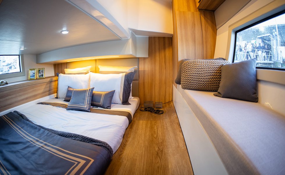O mar exige escolhas precisas. Estofamentos náuticos que resistem ao sol e ao sal, carpetes anti-mofo, vidros amplos capazes de iluminar mesmo as áreas mais compactas e marcenaria sob medida formam a base de interiores que precisam durar muitos anos.