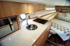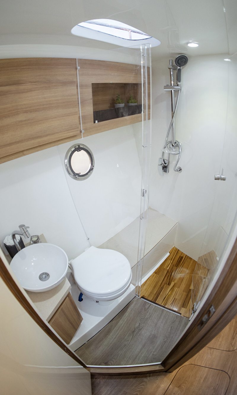 Em boa parte das embarcações de lazer entre 30 e 40 pés — faixa bastante comum no mercado brasileiro — o espaço útil interno costuma ficar na casa dos 15 a 25 m², dependendo do layout e da configuração escolhida. É uma metragem equivalente a um estúdio compacto, mas que precisa acomodar áreas sociais, cabines, cozinha, banheiro e circulação. Esse dado dá a medida da tarefa: fazer com que um interior reduzido funcione como uma pequena casa em movimento, sem sensação de aperto.
