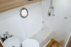 As pedras usadas em cozinhas e banheiros são selecionadas não só pela estética, mas pela resistência às mudanças de temperatura. O inox — presente em detalhes estruturais e decorativos — precisa ter alto desempenho para enfrentar umidade constante. Nada é escolhido por acaso: cada material sustenta um tipo de vida a bordo.