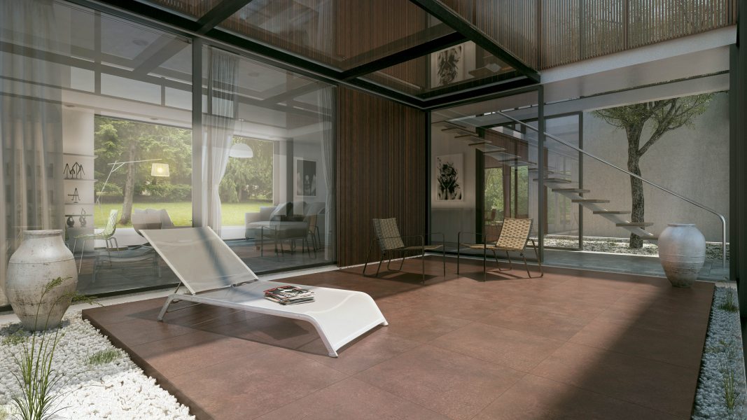 Nos dias atuais, o aço oxidado é sinônimo de arquitetura contemporânea. A Série Oxi Ruddy traz a textura do metal aliada à durabilidade do porcelanato. As peças, em tonalidades marrom ferrugem, reproduzem com perfeição as nuances criadas pela ação do tempo. É ideal para ambientes internos e externos como terraços e calçadas, em grandes áreas ou para valorizar pequenos detalhes, como painéis decorativos. As bordas retificadas permitem a aplicação com juntas mínimas de 1mm que valorizam a paginação e o efeito de placa única. Formato: 90x90cm.
