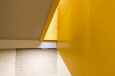 Para resolver estas questões os arquitetos refizeram o espaço e o enveloparam, quase completamente, em painéis sob medida e móveis de laca amarela. A escadaria de acesso também foi revestida no material e combinada a luzes embutidas e pisos de cimento polido.