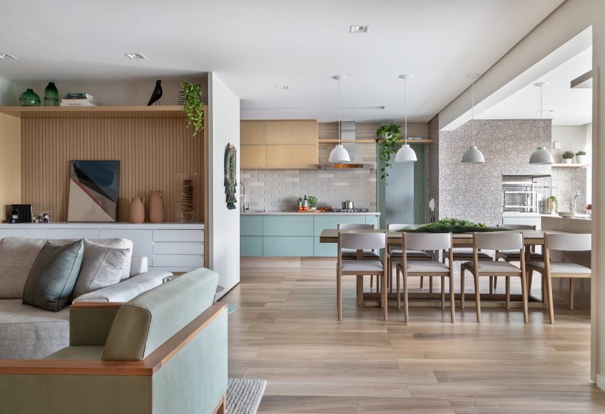 Ao entrar no apartamento, moradores e visitantes são recebidos pela madeira ripada que abraça boa parte da sala. Além da textura contemporânea, sua presença camufla a existência dos armários que recebem louças e outros itens que atendem as salas e a cozinha. A integração área social não foi prejudicada pela setorização visual dos diversos espaços: de um lado, o espaço de TV é definido pela composição de sofás, poltronas e tapetes e, logo atrás, o cantinho do café com um prático móvel desenhado pela arquiteta separa a sala da cozinha.