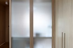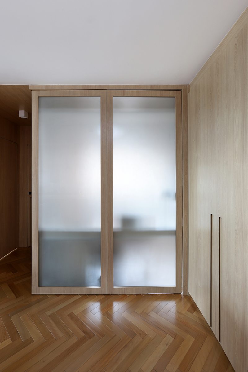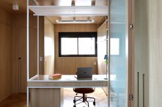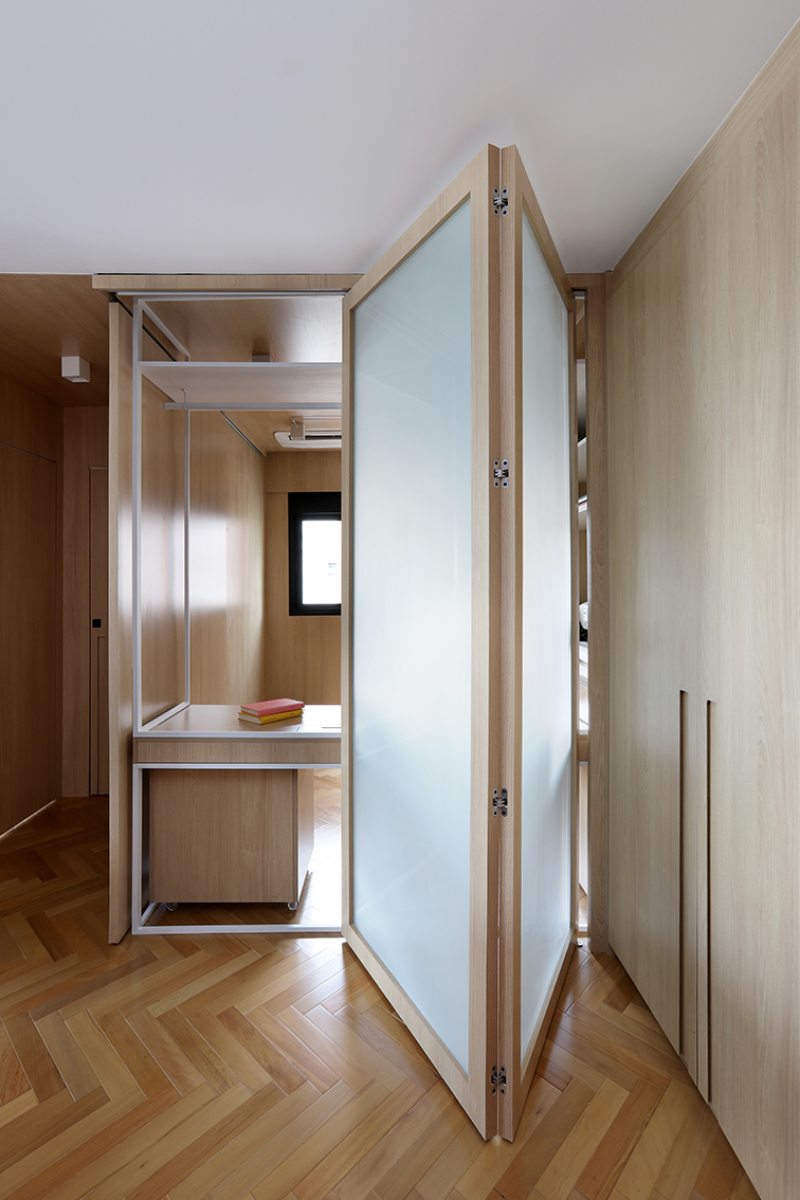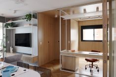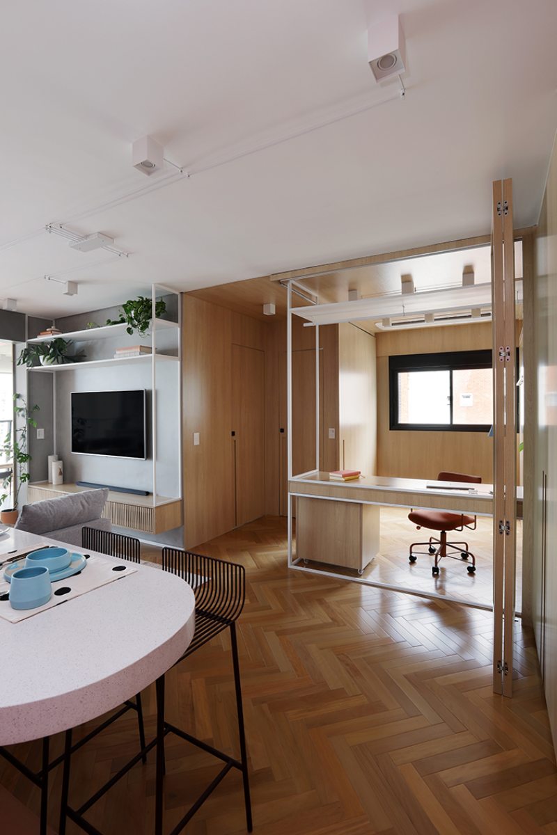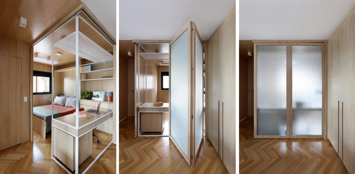 A bancada conta com gavetas, compartimentos para armazenar notebook e objetos menores, além de tomadas embutidas e ocultas. No mesmo ambiente, uma cama de casal fica embutida em um móvel com acabamento em MDF Carvalho da Arauco, permitindo o uso do espaço tanto como área de trabalho quanto como dormitório para hóspedes. Quando utilizado como quarto, um sistema de portas em camarão faz o fechamento do ambiente, garantindo privacidade sem interferir na área social.