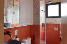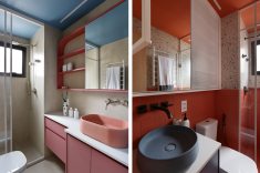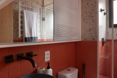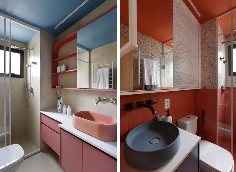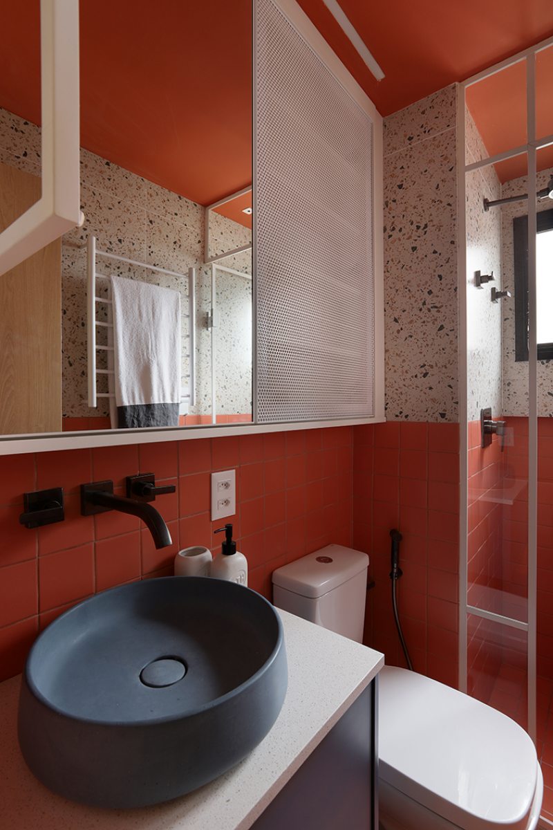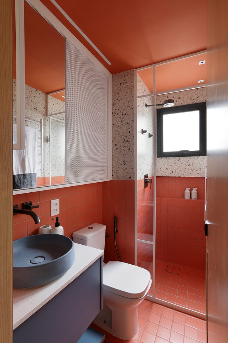 No lavabo, piso e meia parede receberam revestimento cerâmico 10×10 na cor coral, estendido até o teto. A outra metade da parede foi revestida em X. A bancada tem tampo em Silestone branco, cuba em concreto azul escuro e armário inferior em azul Rio de Cascalho da Coral. O conjunto é finalizado com armário espelhado em serralheria branca e porta em chapa perfurada, também branca.