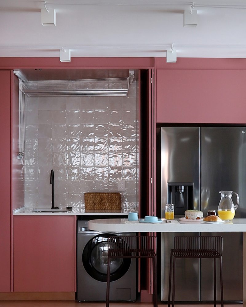A lavanderia foi posicionada na parte interna do apartamento e ficou totalmente embutida em um armário com portas em laca cor Salão Rosa. No interior do móvel estão o tanque, a máquina lava e seca e um varal com sistema funcional, mantendo o espaço oculto e visualmente integrado à área social.
