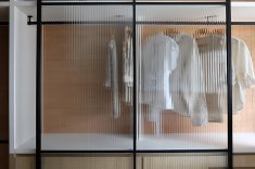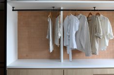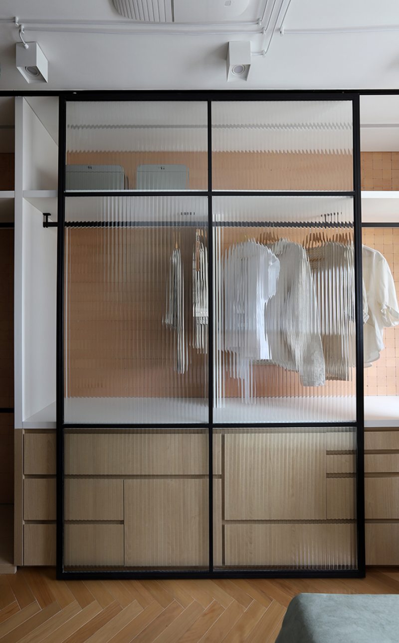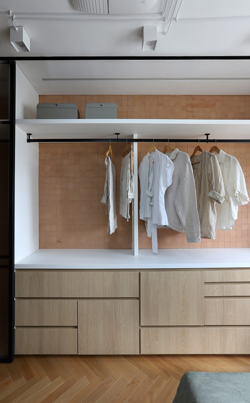 A suíte recebeu um sistema de marcenaria planejada para otimizar armazenamento e circulação. O armário, sem portas, deixa as roupas expostas, remetendo à organização de araras de loja. Na parede, o revestimento da Lepri contribui para um clima mais acolhedor. A área de sapateira possui prateleiras móveis e porta de correr em serralheria com vidro camuflado, que se desloca lateralmente. Na outra extremidade, uma penteadeira com iluminação em LED embutida e nichos organiza bijuterias e maquiagem.