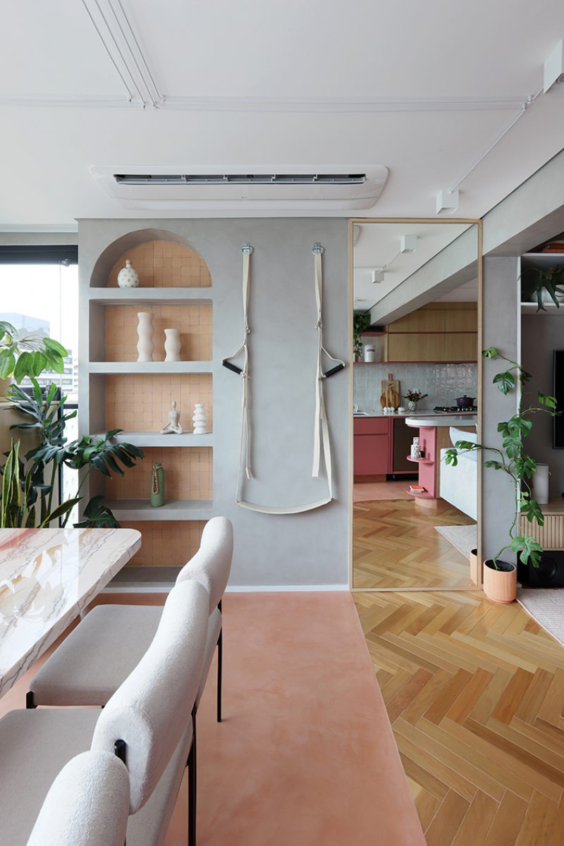 A separação entre cozinha e sala acontece por meio de uma bancada em balanço com cantos arredondados. Do lado da cozinha, o móvel abriga armários inferiores e nichos para pequenos eletrodomésticos. Voltado para a sala, o mesmo elemento funciona como aparador do sofá. Ainda na área social, uma das paredes foi destinada à instalação de equipamentos para exercícios, atendendo à prática de yoga e atividades funcionais da moradora.