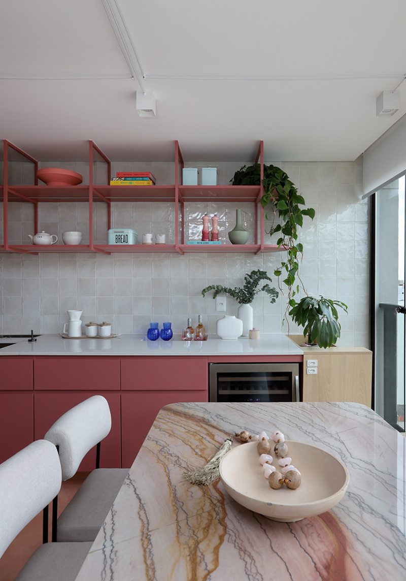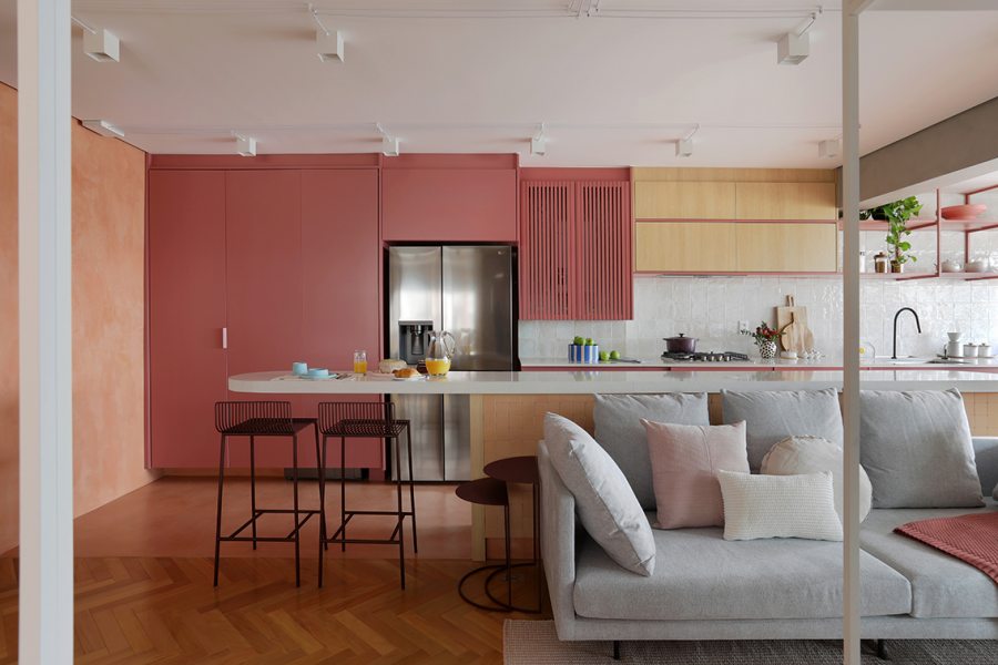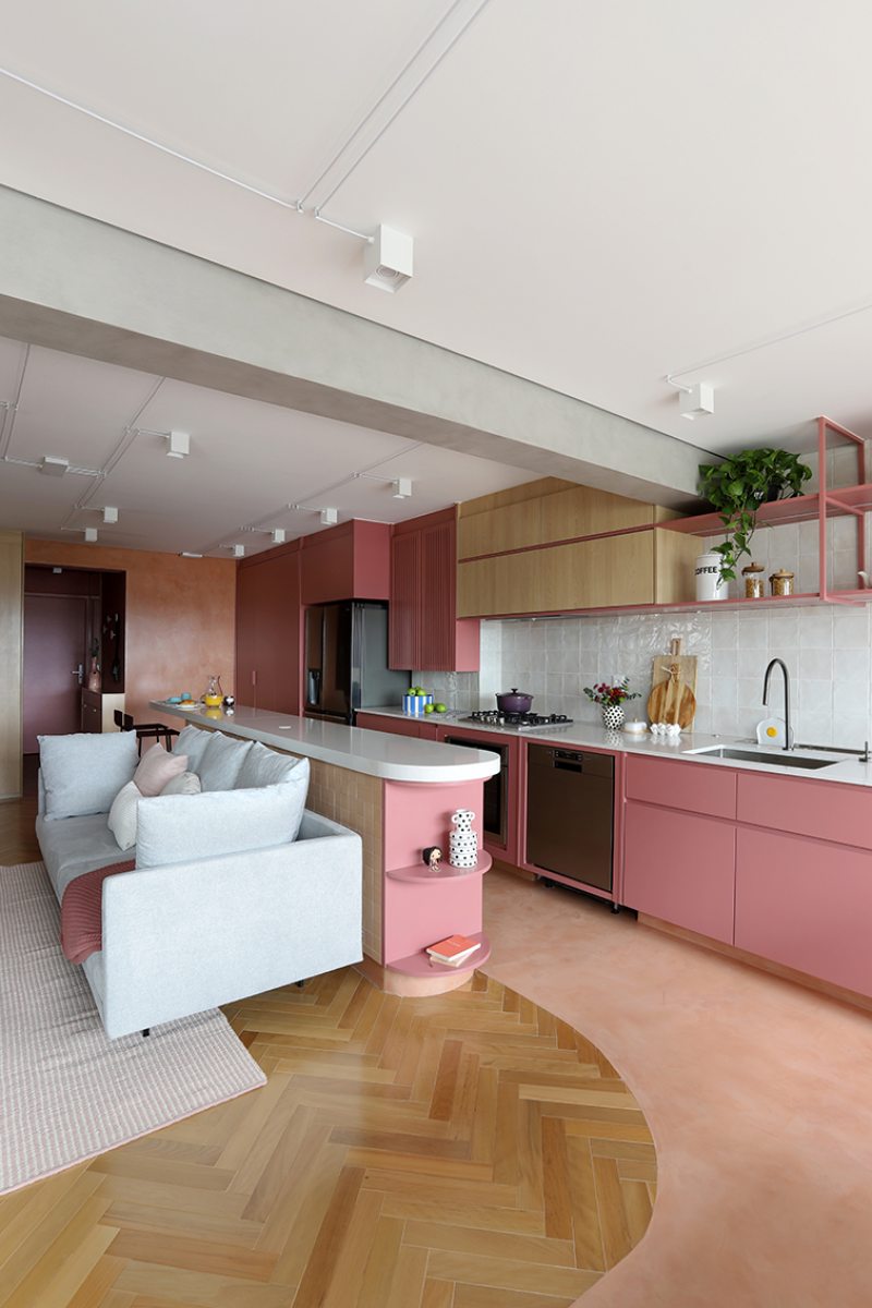 A cozinha, integrada à área social, concentra a aplicação mais intensa da cor. Toda a marcenaria recebeu acabamento em laca na cor Salão Rosa, repetida na serralheria e nas prateleiras. Armários suspensos em MDF Carvalho da Arauco apresentam frisos em rosa. Para diferenciar os usos, o piso recebeu paginação curva e contínua, conectando os ambientes.