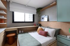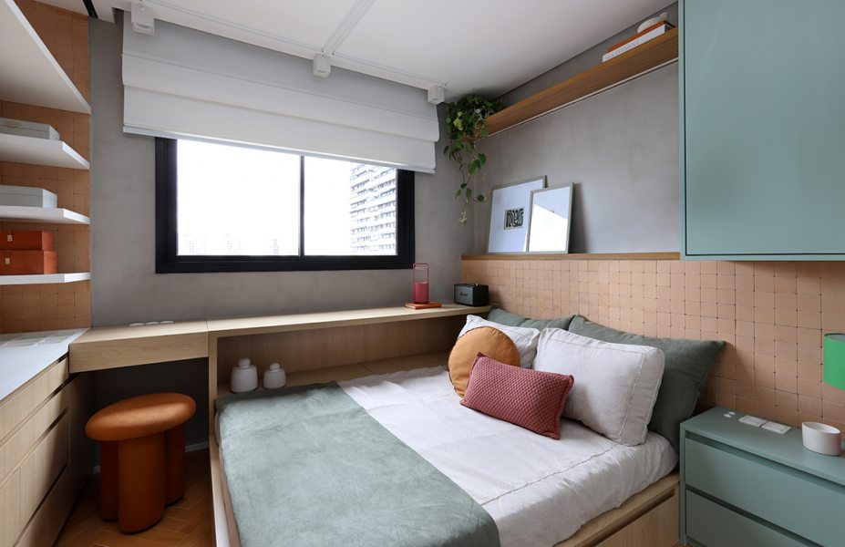 A cama foi posicionada ao lado de uma bancada-baú com gaveteiros inferiores, solução que ampliou a circulação e permitiu a instalação de mesa de cabeceira e armário suspenso. A parede da cabeceira recebeu o mesmo acabamento aplicado na área do armário, com suportes para quadros e iluminação em LED. Neste ambiente, predominam o verde pastel e o MDF Carvalho da Arauco, enquanto o rosa aparece pontualmente em objetos e almofadas.