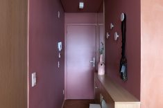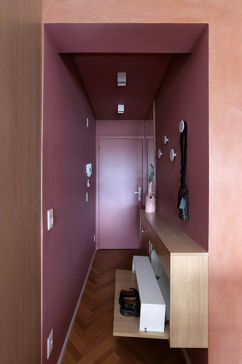 A principal diretriz do projeto foi otimizar a planta por meio de marcenaria planejada. O mobiliário fixo, todo desenhado pelo escritório, organizou espaços, criou áreas de armazenamento e ocultou ambientes técnicos, permitindo que o apartamento funcionasse de forma flexível ao longo do dia. O rosa aparece em diferentes tonalidades e é utilizado como elemento de identidade e continuidade visual. Logo na entrada, um hall em color block rosa escuro marca a transição para a área social. Nesse espaço, um móvel em MDF Carvalho da Arauco funciona como sapateira e aparador, acompanhado por penduradores em pedras naturais. A porta de entrada foi laqueada no mesmo tom das paredes.