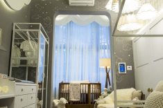 O quarto do bebê utiliza a cor Branco Platinum na cômoda, prateleiras, moldura de espelho e na base da cama.