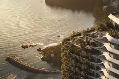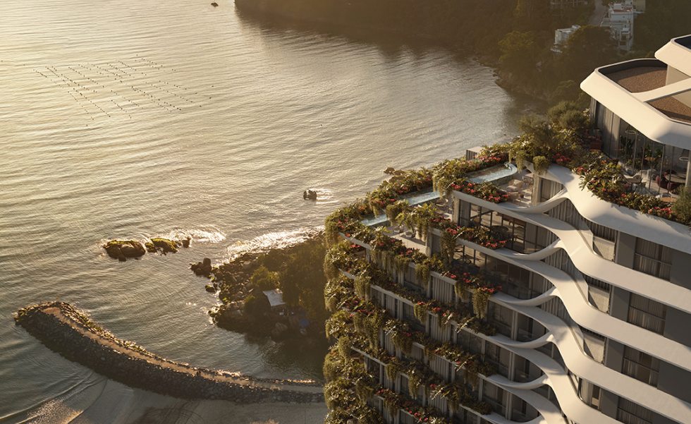 A fachada, desenhada por Rafael Castro, do escritório Castro Arquitetos, tem volumetria sinuosa que remete ao movimento das ondas. Já o paisagismo, desenvolvido pelo Estúdio Daniel Nunes, reforça essa leitura ao trabalhar espécies e desenhos que se integram ao edifício sem protagonismo excessivo, incluindo um layout no quinto pavimento que faz referência à pesca artesanal da região.