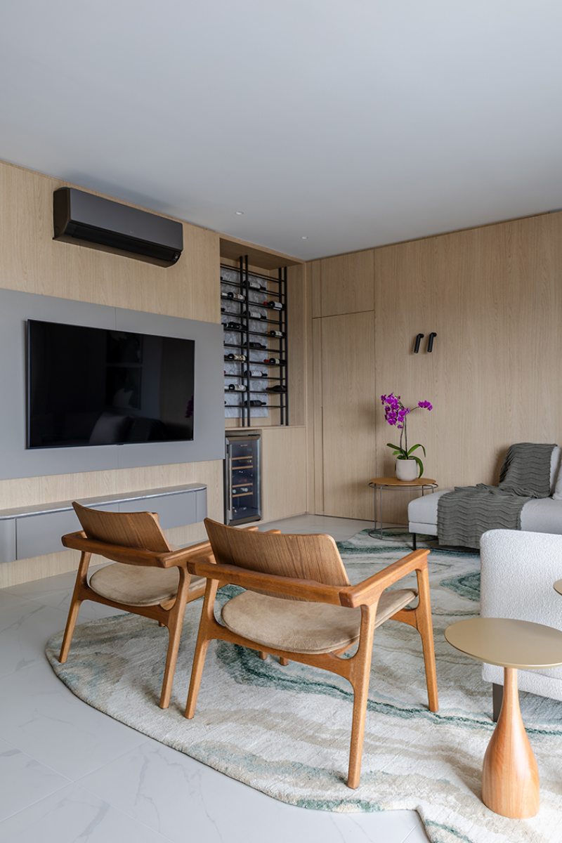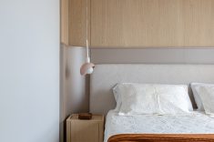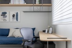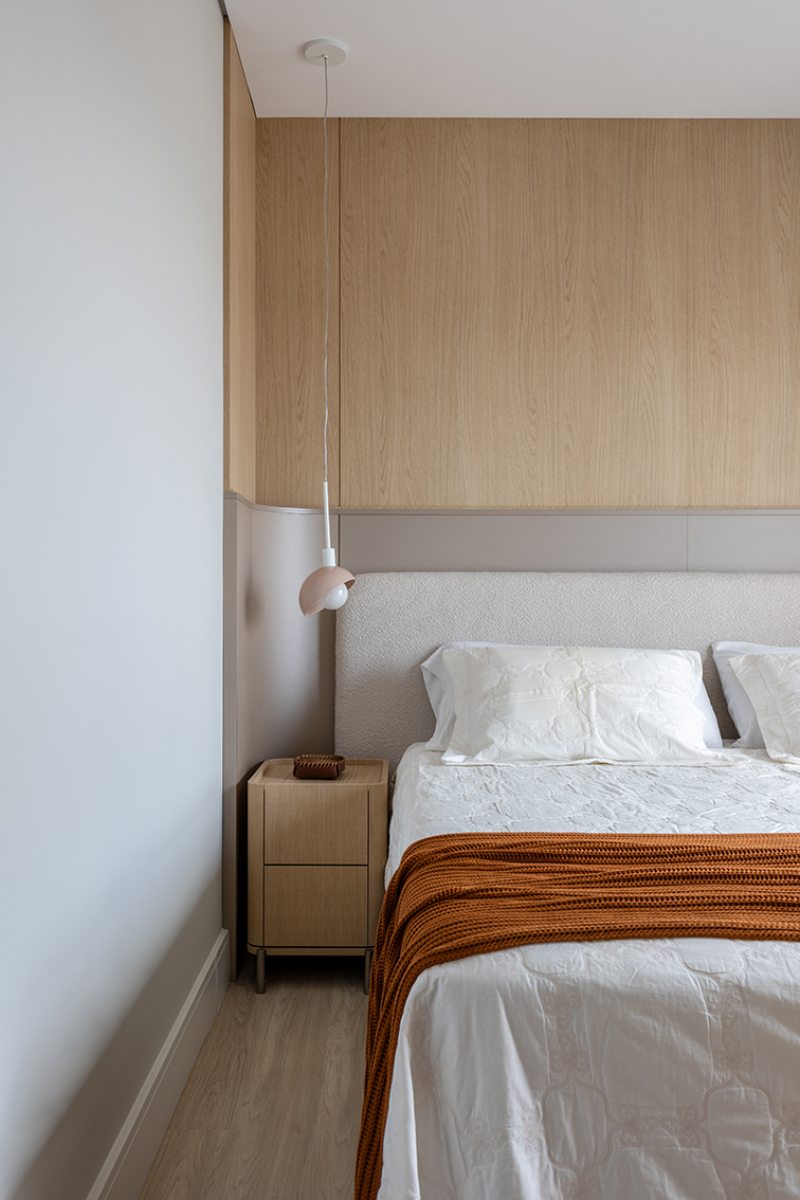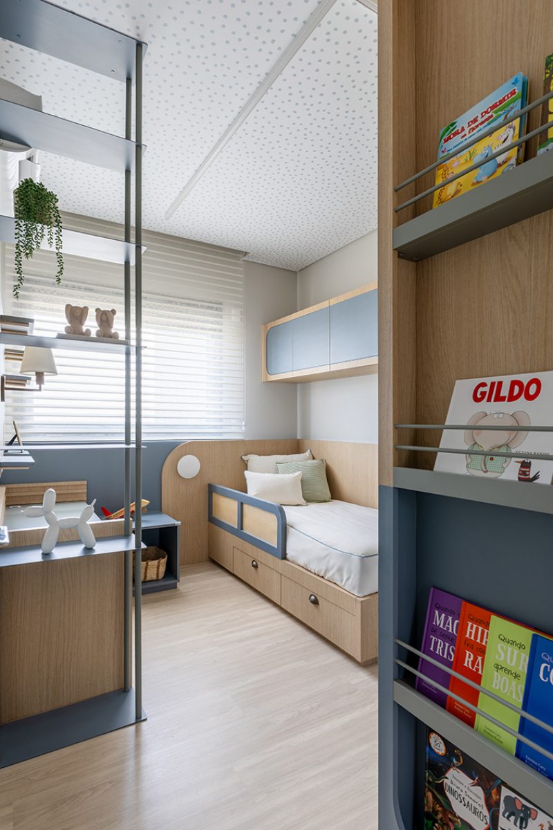 O escritório foi pensado para atender demandas múltiplas, funcionando como ambiente de trabalho, reuniões e quarto de hóspedes — um recurso cada vez mais presente nos projetos contemporâneos. Já o dormitório infantil aposta em uma abordagem lúdica e sensível: formas curvas, cores suaves e papel de parede no teto criam um ambiente que estimula a imaginação e acompanha o desenvolvimento da criança.