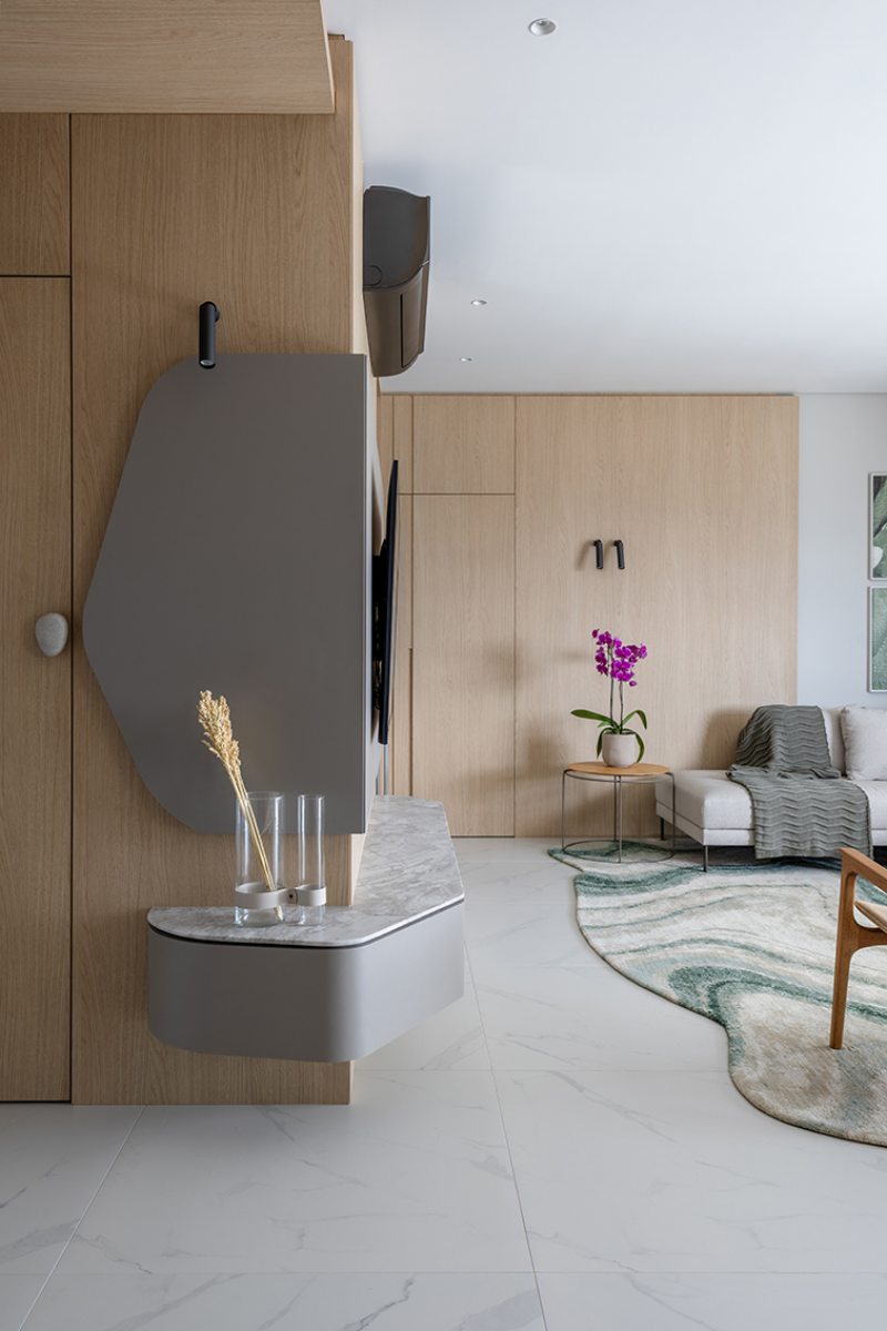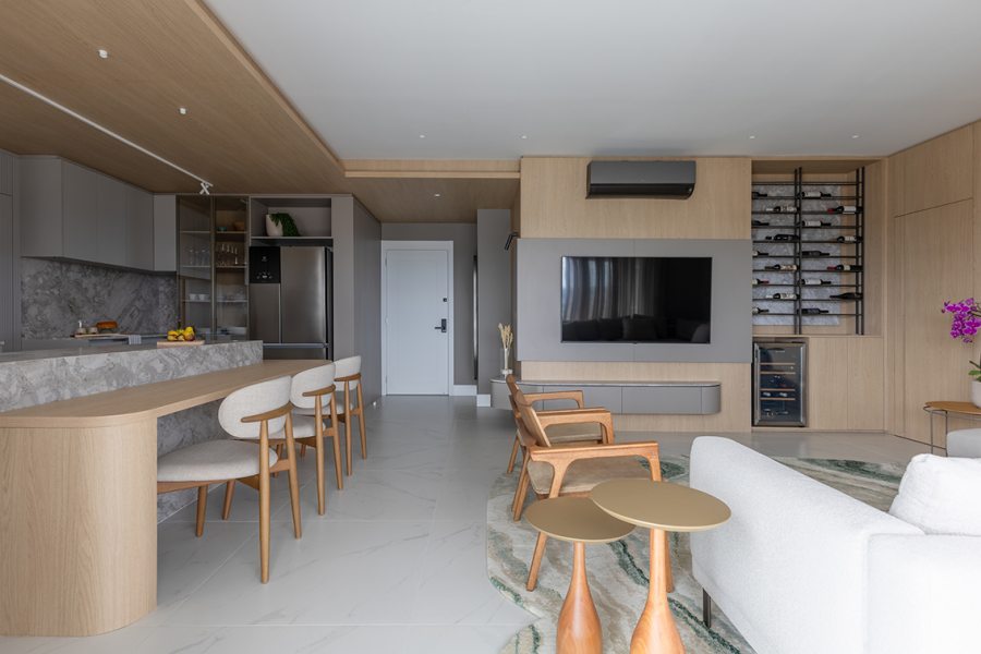 O apartamento apresentado nesta edição da Casa Sul ilustra bem esse olhar conjunto. A planta original foi reorganizada para ampliar a integração: a varanda deixou de ser um espaço apartado e passou a compor o living, abrigando a sala de jantar em uma área mais iluminada e contínua. A marcenaria sob medida com cantos arredondados e detalhes personalizados, traz unidade visual e suaviza as transições entre ambientes. Na cozinha, o mármore Kronos e a paleta neutra conferem protagonismo ao espaço, criando uma área funcional e elegante.