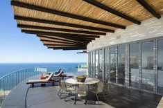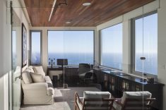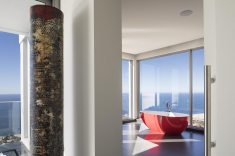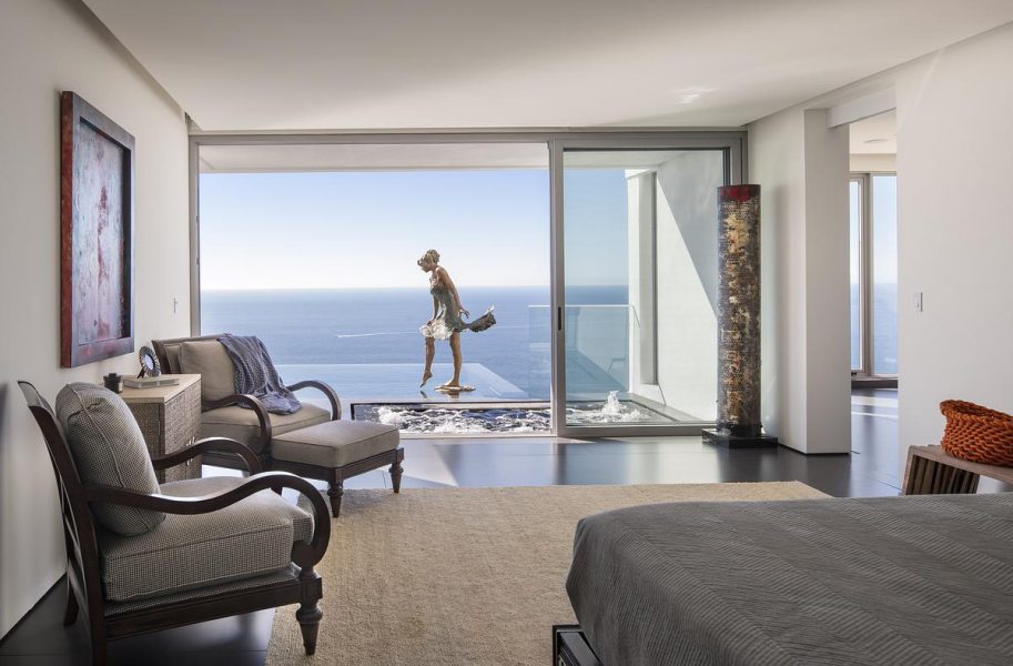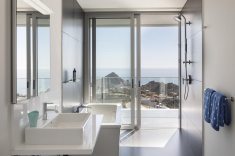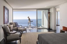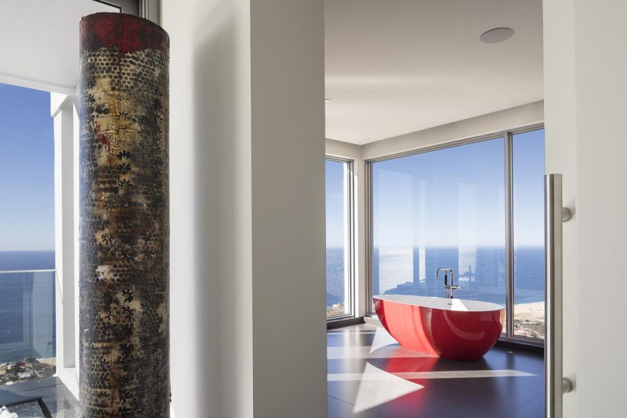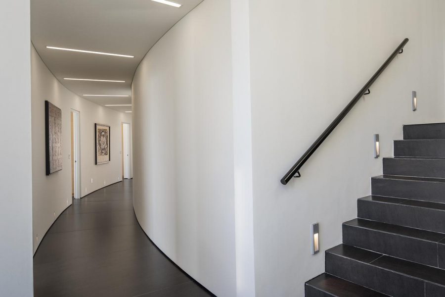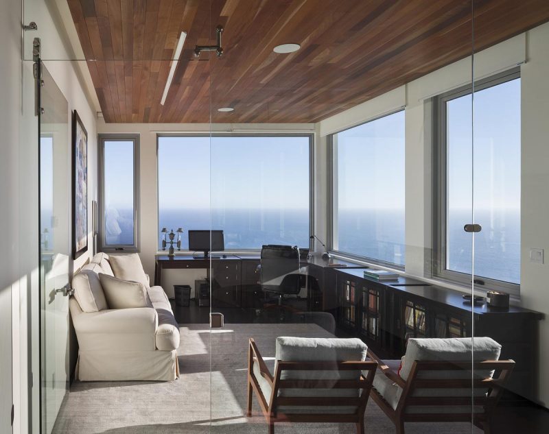 A implantação elevada permite que o projeto revele uma de suas características mais marcantes: as vistas panorâmicas sobre o oceano, o deserto e a cidade. Para potencializar essa experiência, os arquitetos criaram um centro de circulação vertical que conecta os três pavimentos — da entrada no nível superior à área social no nível intermediário e aos quartos no nível inferior.
