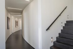 Ao chegar ao pavimento principal, o visitante é recebido por um espaço que se abre completamente. Uma extensa parede de vidro dobrável transforma sala de estar, jantar e cozinha em um ambiente contínuo com o terraço frontal. Quando as portas se recolhem, interior e exterior se tornam um só — um gesto que acompanha a curvatura suave da fachada e enquadra o horizonte em diferentes direções.