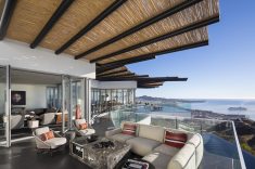 O avanço do terraço superior oferece sombreamento natural, e a piscina estreita acompanha toda a borda frontal, criando uma lâmina d’água contínua em direção ao mar — cenário onde é comum observar baleias em movimento durante determinadas épocas do ano.