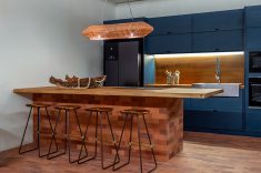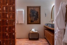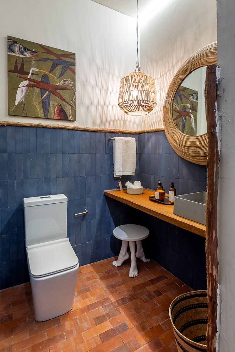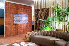 A terra compactada, por exemplo, reaparece em paredes e painéis que mantêm a cor e a densidade do solo. A madeira surge com menos tratamento, revelando veios, nós e variações naturais. Pedras são aplicadas em cortes menos uniformes, deixando visível sua origem geológica.