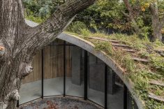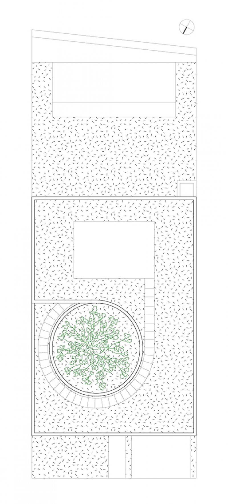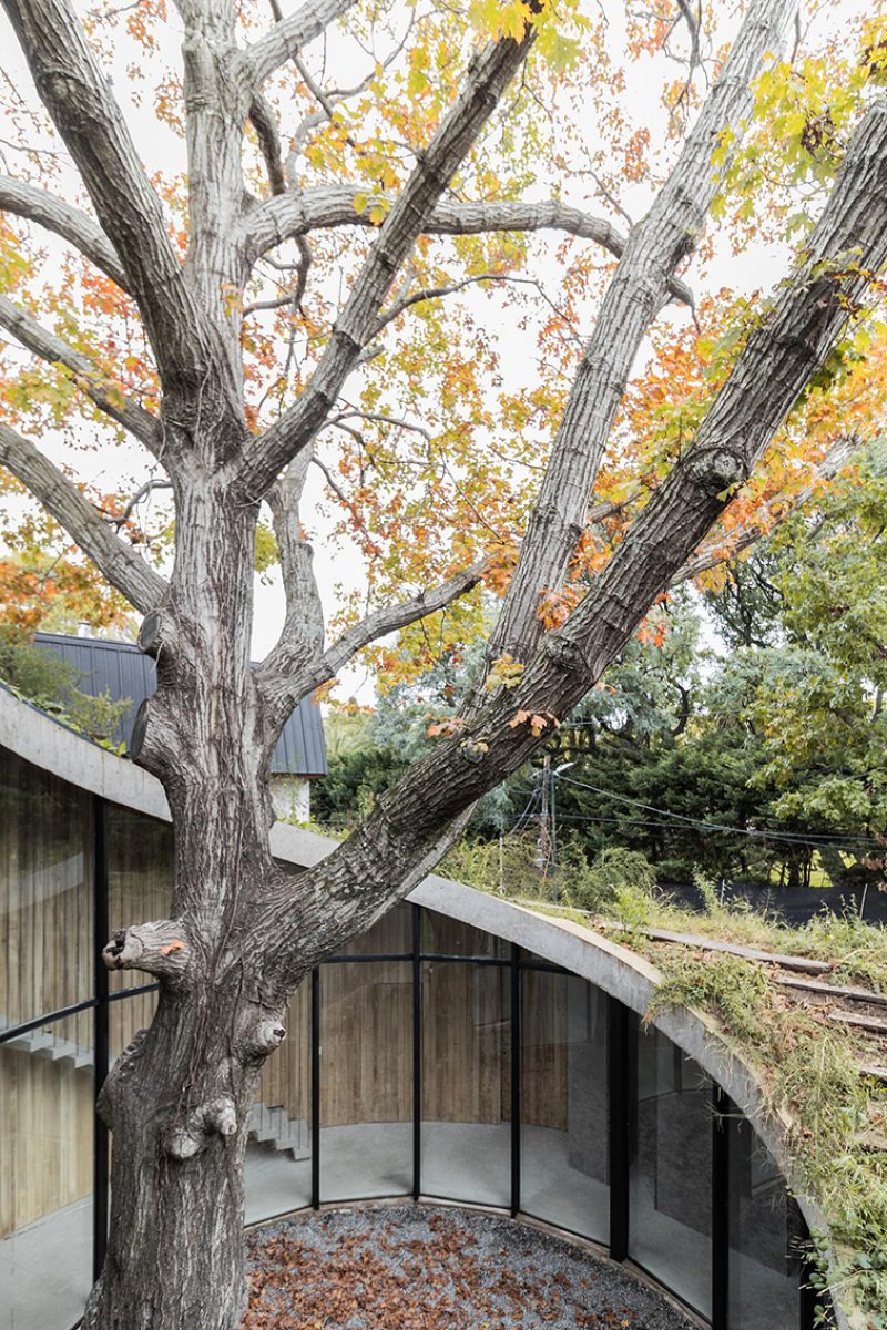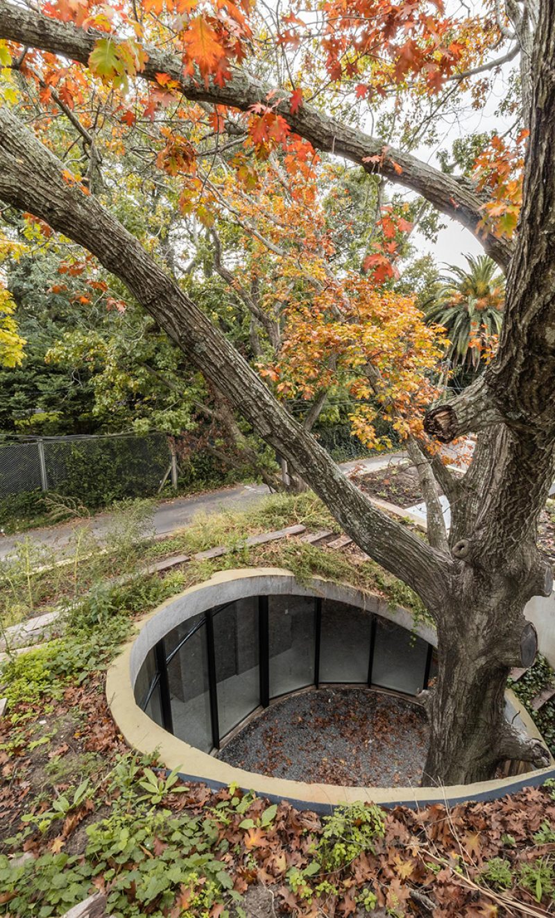 Ao se aproximar da casa pela rua, encontra-se uma fachada cega, com o terreno inclinado configurado no telhado. Do centro dele, o imponente carvalho surge majestosamente, desafiando a lógica convencional. Ao cruzar o limiar da porta de entrada, um pátio circular é revelado, com o carvalho no centro, gerando uma atmosfera de contemplação excitante.