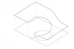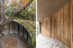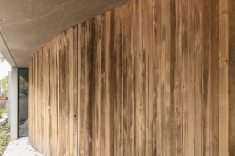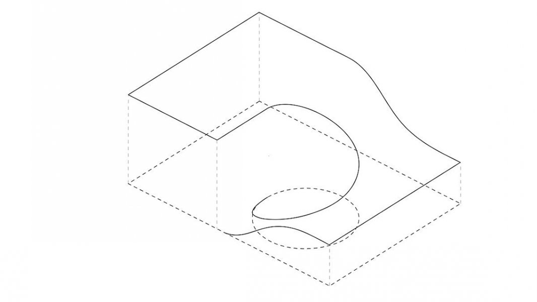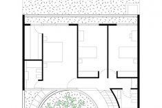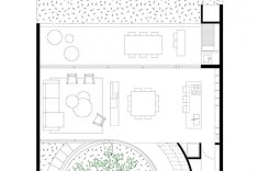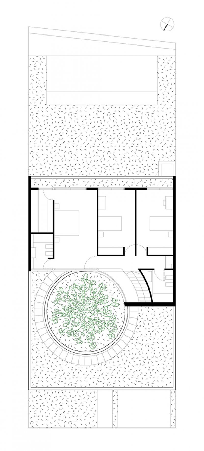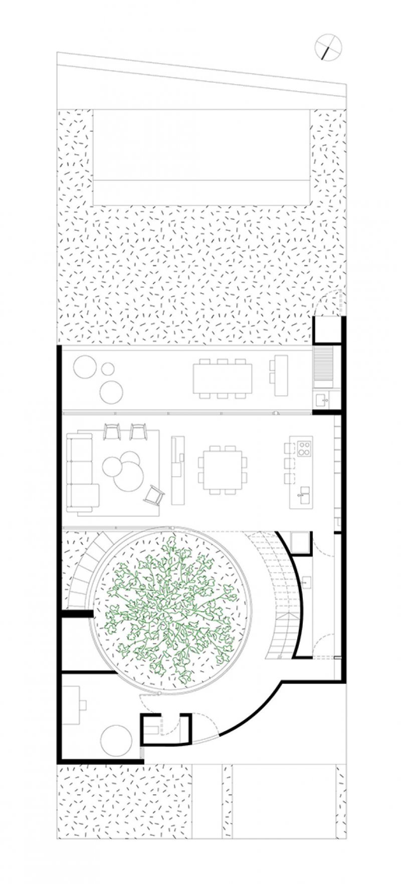 Ao se aproximar da casa pela rua, encontra-se uma fachada cega, com o terreno inclinado configurado no telhado. Do centro dele, o imponente carvalho surge majestosamente, desafiando a lógica convencional. Ao cruzar o limiar da porta de entrada, um pátio circular é revelado, com o carvalho no centro, gerando uma atmosfera de contemplação excitante.