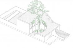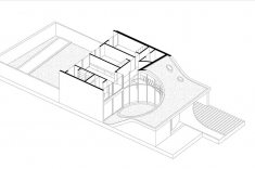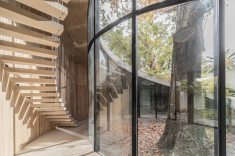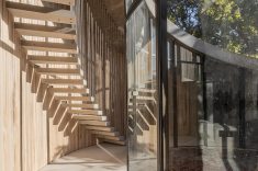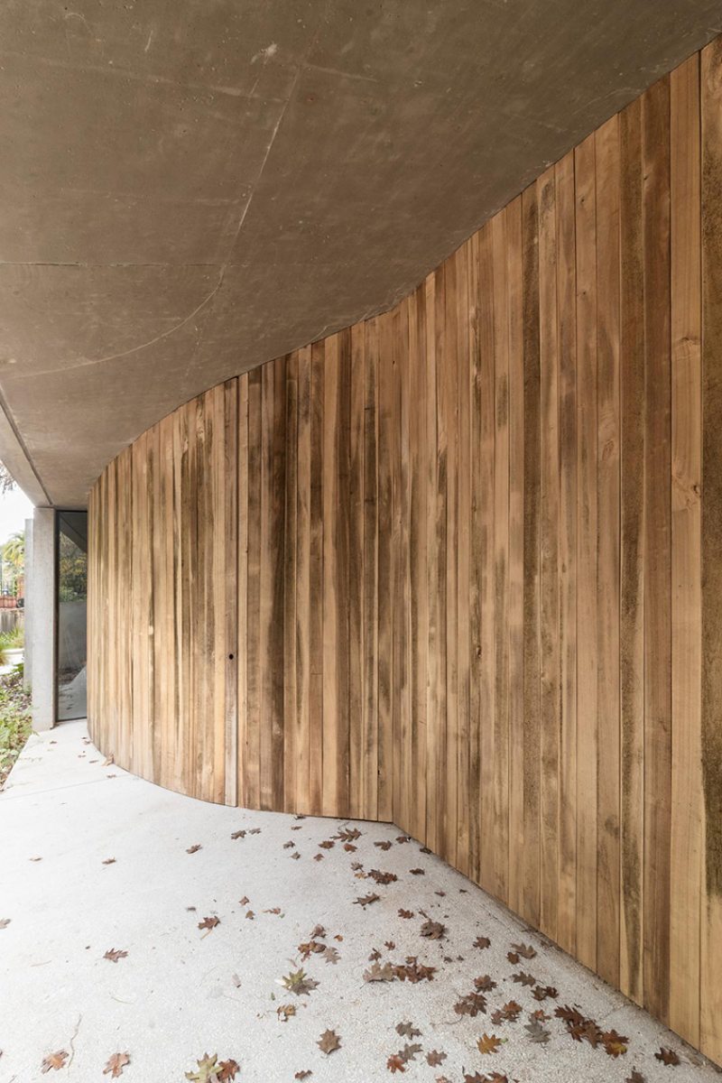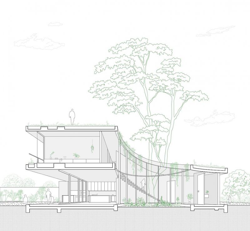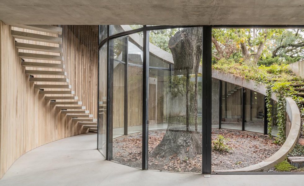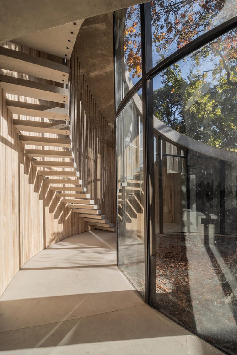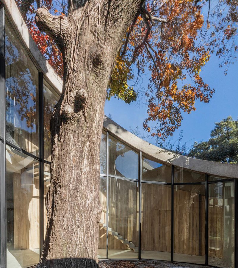 A arquitetura revela uma rota, uma viga que se origina no térreo e envolve o carvalho do nível zero, ascendendo até alcançar o segundo nível e configurando uma espiral harmoniosa ao seu redor. A luz, sempre entrando deste ponto cardinal, favorece a dança das folhas do carvalho, permitindo a entrada de mais luz durante o inverno e protegendo o interior nos dias quentes de verão.