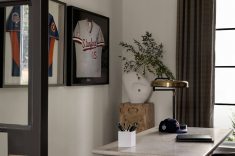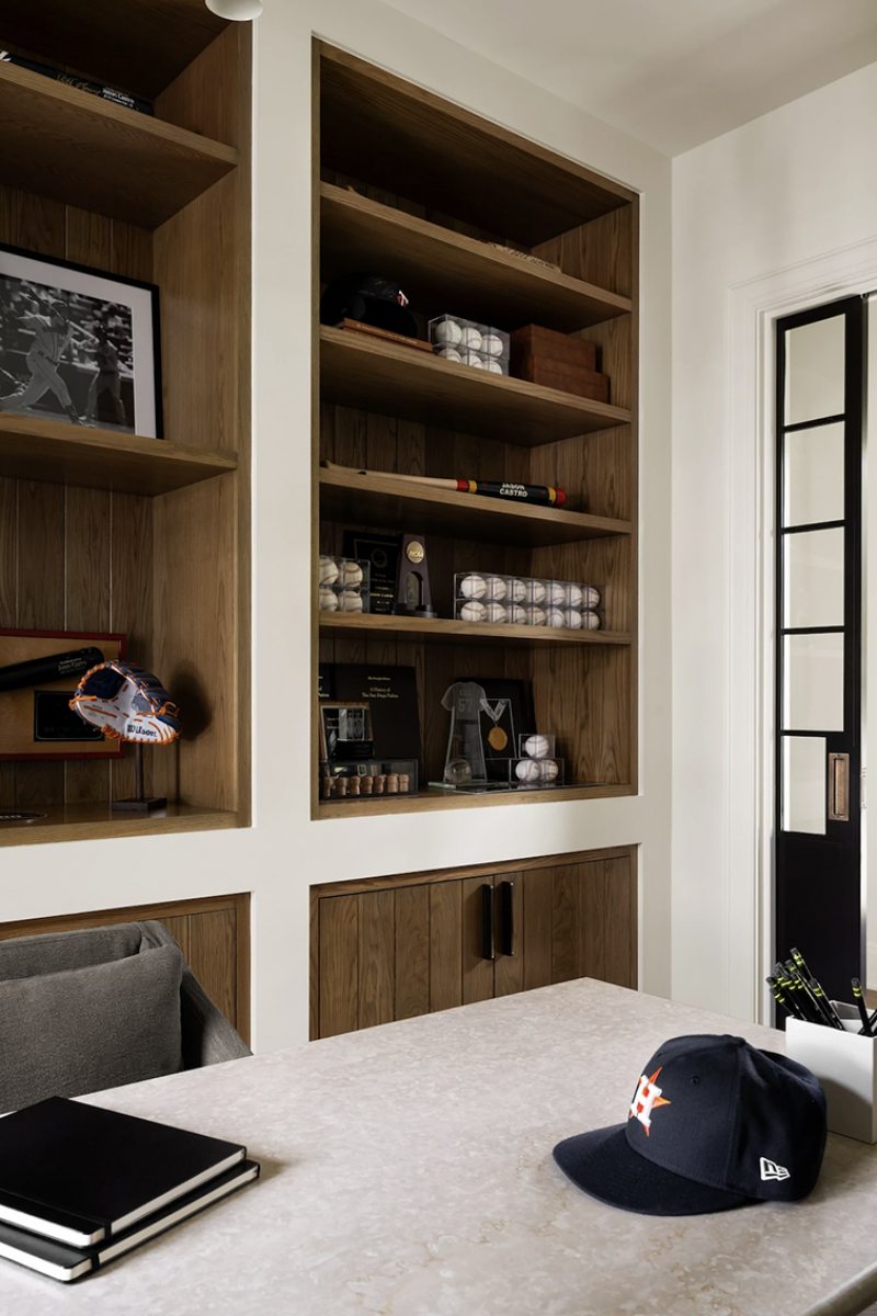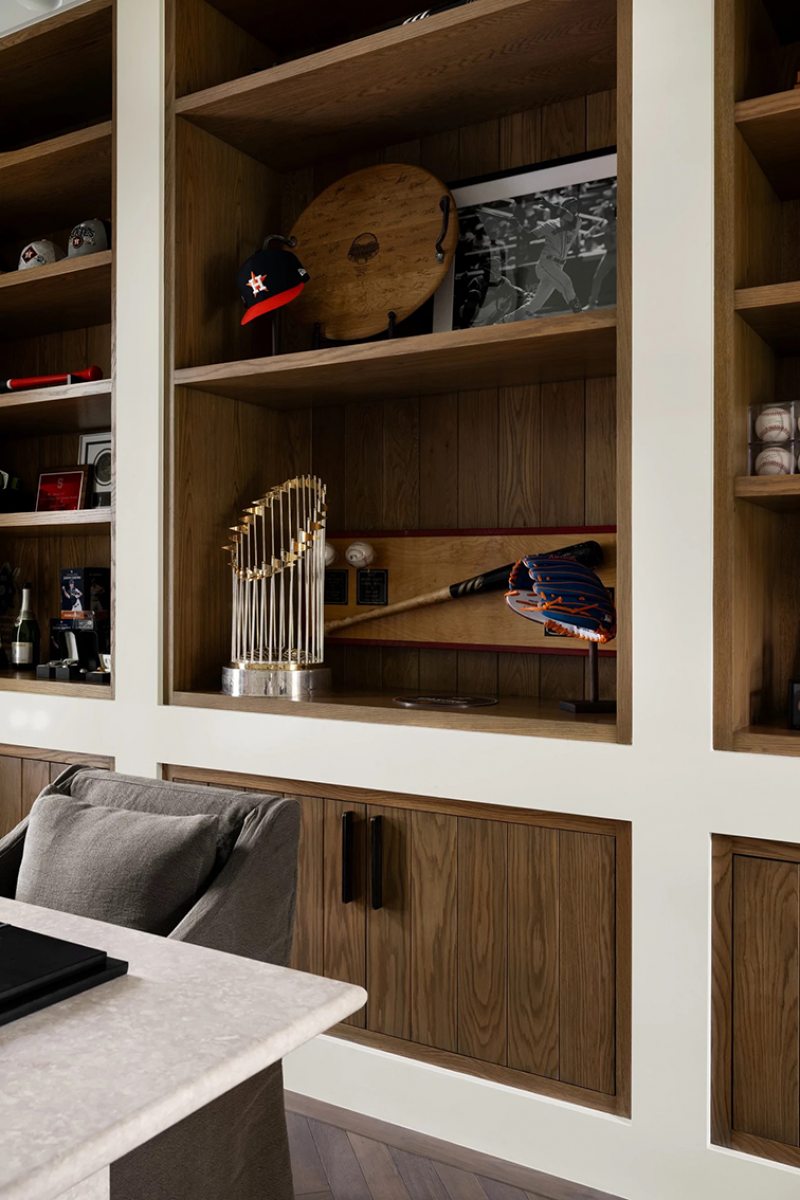 Um dos pontos que reforçam o caráter pessoal do projeto é a área dedicada à exposição de memorabilia do beisebol, incorporada à marcenaria. O recurso revela como arquitetura e interiores também acomodam a história de quem vive ali, sem recorrer a elementos chamativos.