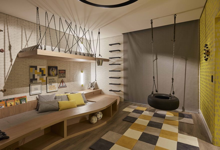 Uma criativa cama suspensa usa cordas como guarda corpo e também para uma possível descida em rapel. Para subir, o acesso pode se valer da parede de escalada ou ainda a escada de marinheiro. Aqui é o descanso do “guerreiro mirim”, que tem fácil alcance a um espaço de relaxamento, logo abaixo, de onde pode assistir TV ou jogar videogame, e a área de descompressão, um nostálgico balanço de pneu. O painel preto que sai detrás da TV e também está presente na área de estudo junto ao closet, pode ser usado para extravasar a criatividade com desenhos ou escritos do usuário. Ele está conjugado à bancada e prateleiras iluminadas, com fundo em papel camurça, além da cadeira com pegada high tech, da Beatriz Maranhão. A descontração geral é reforçada pelo papel de parede predominante no espaço do quarto, com fundo amarelo e estampa de letras grafite em paleta que inclui o cinza e o preto. No banheiro, o conforto da madeira no teto, parede e bancada aproxima o jardim vertical, dentro do conceito de biofilia. Destaque aí para o inusitado pendente com seis tubos amarelos.