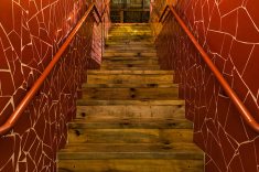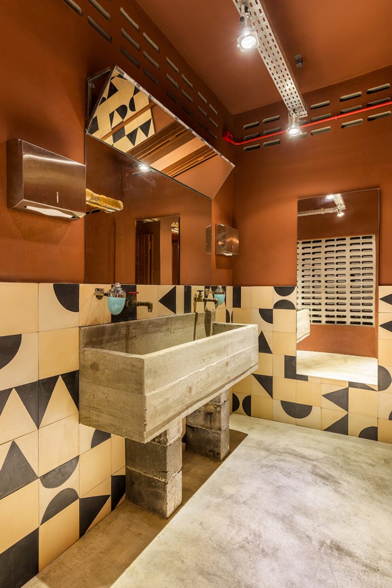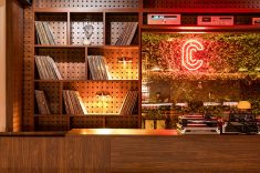 No interior, o contraste entre o antigo e o novo é marcante: telhas cerâmicas e tijolos aparentes preservam a memória, enquanto um bar em inox e iluminação cênica reforçam o tom contemporâneo. O listening bar em madeira, com acústica projetada especialmente para a música, cria um clima envolvente, com balcão em azulejos vermelho-escuros e uma seleção de discos que acompanha a coquetelaria autoral de Gabriel Bueno, finalista do World Class, uma das competições de coquetelaria mais prestigiadas do mundo, que reconhece os melhores bartenders do planeta. As receitas combinam técnicas de clarificação, infusões e defumações, produzidas artesanalmente, sem uso de xaropes industriais.