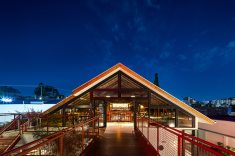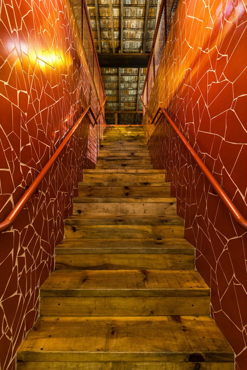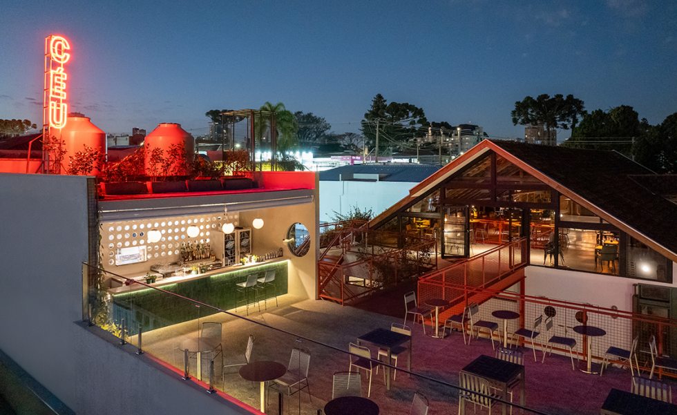 Instalado em uma construção dos anos 1950, o Céu Bar preserva a fachada original e a memória do edifício, mas revela um interior contemporâneo e vibrante. O projeto foi pensado para conectar o visitante ao céu e ao pôr do sol, com grandes aberturas, linhas visuais amplas e integração entre ambientes internos e externos. No térreo, o espaço ao ar livre se abre para a natureza e a convivência, com um bar em estilo vitrine que convida a encontros. Uma escada e passarela metálicas em vermelho conduzem ao rooftop, onde a vista panorâmica da cidade se transforma em palco para a noite curitibana.