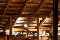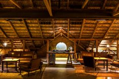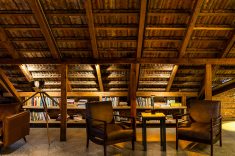Parte do encanto do espaço está na forma como reutiliza elementos originais: paredes de mármore viraram mesas de centro, armários antigos se transformaram em portas de estoque e até a mesa do DJ foi feita com a madeira do telhado original. Essa escolha reforça a estética orgânica e sustentável do projeto.