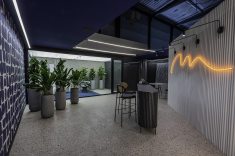 O ambiente faz uma reflexão sobre a garagem contemporânea. Será que, nos dias de hoje, ela deve ser apenas um lugar para guardar o carro? O arquiteto acredita que não, que é preciso pensar que espaços nobres como esses devem ser multifuncionais, serem também locais para o lazer, convívio e permanência. O carro elétrico, no centro do ambiente, é o protagonista e o mobiliário quando fechado, reflete toda a tecnologia do mesmo, mas quando aberto revela e oferece múltiplas possibilidades de usos. O preto é a aposta de cor, com todas as suas possibilidades de texturas e reflexos.