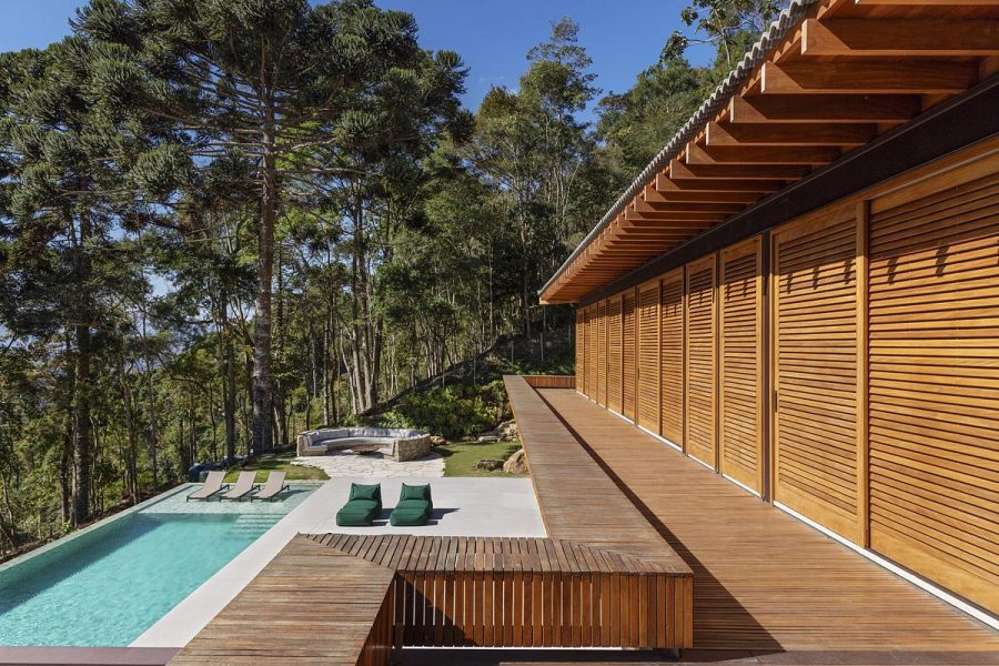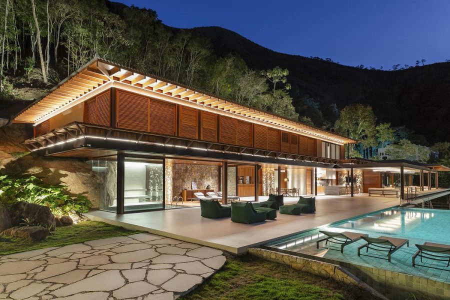 Grandes aberturas de vidro, áreas sociais integradas e espaços externos voltados para a vista completam o conjunto, que transforma a topografia acidentada em parte essencial da experiência da casa. Confira abaixo em nossa galeria de imagens.