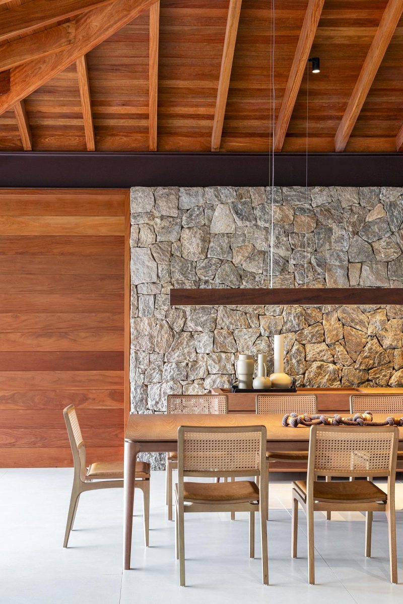 “Como ponto de partida, adotamos a estrutura metálica exposta, combinada com madeira exposta nos telhados e paredes revestidas a pedra”, explica a arquiteta Alice Lindenberg.