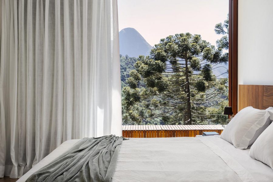 Os cômodos foram projetados e posicionados para que sempre aproveitem ao máximo a vista privilegiada. Grandes aberturas de vidro trazem luz natural para o interior e garantem transparência e fluidez entre o interior e o exterior.