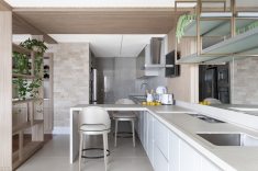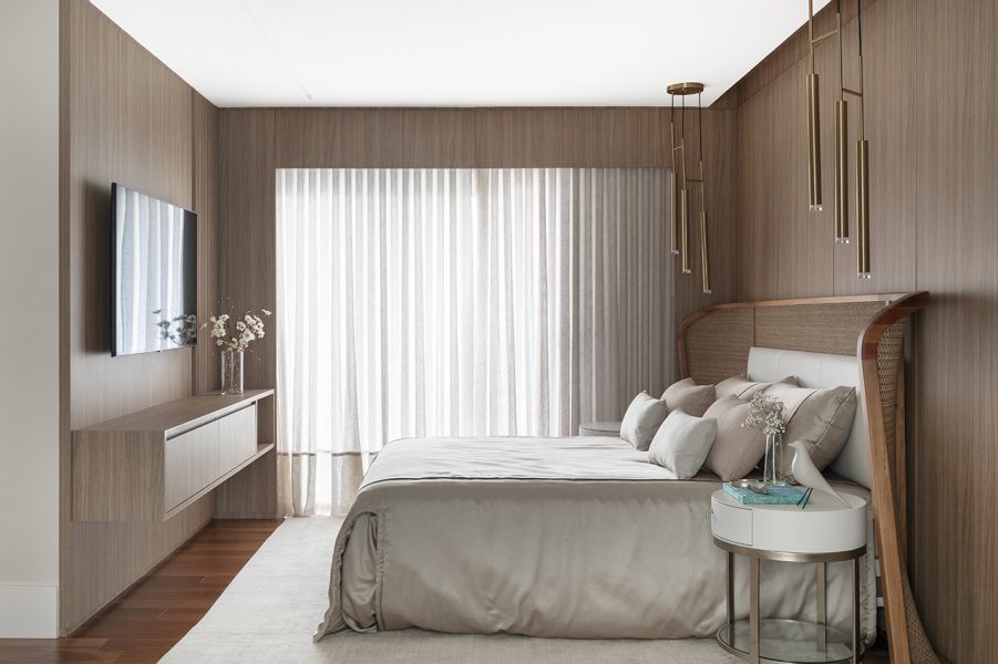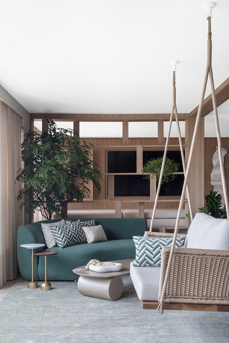 O primeiro gesto do projeto foi abrir os ambientes: integrar cozinha, sala de jantar e varanda para favorecer a convivência e a luz. A base neutra — com piso de madeira, painéis e teto amadeirados — cria continuidade visual e sustenta a paleta de tons terrosos, com pontos de verde e texturas naturais. A iluminação é automatizada, com cenas ajustáveis conforme o uso. O mobiliário combina itens da Sierra e Masotti.
