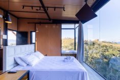 Localizado em Anitápolis, a poucos quilômetros de Florianópolis, o complexo Vistas de Anitá adota uma arquitetura pensada para não competir com o entorno. As cabanas ocupam um terreno privativo de 28 hectares e foram implantadas para preservar vistas abertas da serra, garantir privacidade e reforçar a sensação de isolamento — sem perder conforto ou qualidade construtiva.