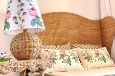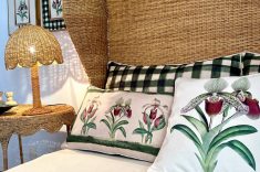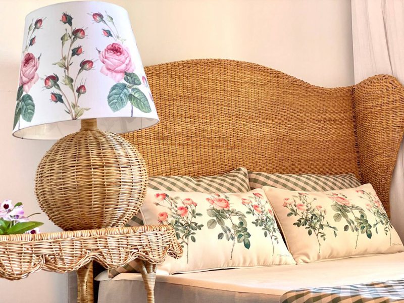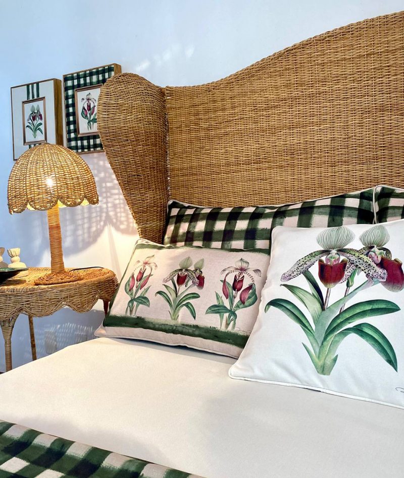As flores ganharam destaque nas peças da Rebeca Duarte Home Decor, com capas de almofadas, peseiras e cúpulas de abajures estampadas com rosas e orquídeas.