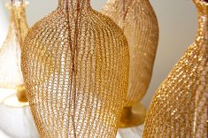 A artista Nao Yuasa revisitou o crochê como símbolo do vínculo entre gerações, criando vasos em fio de metal banhados a ouro.