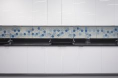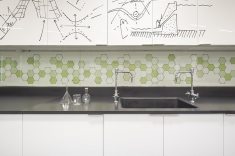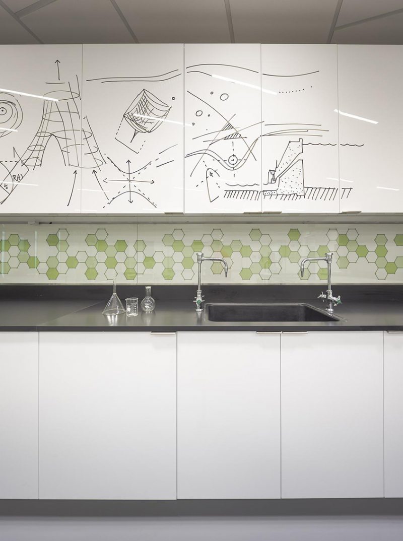Bancadas e backsplashes duráveis e fáceis de limpar: o uso intenso inerente a um laboratório de ciências exigiu materiais que pudessem suportar o desgaste diário e fossem simples de higienizar, garantindo um ambiente limpo e seguro.