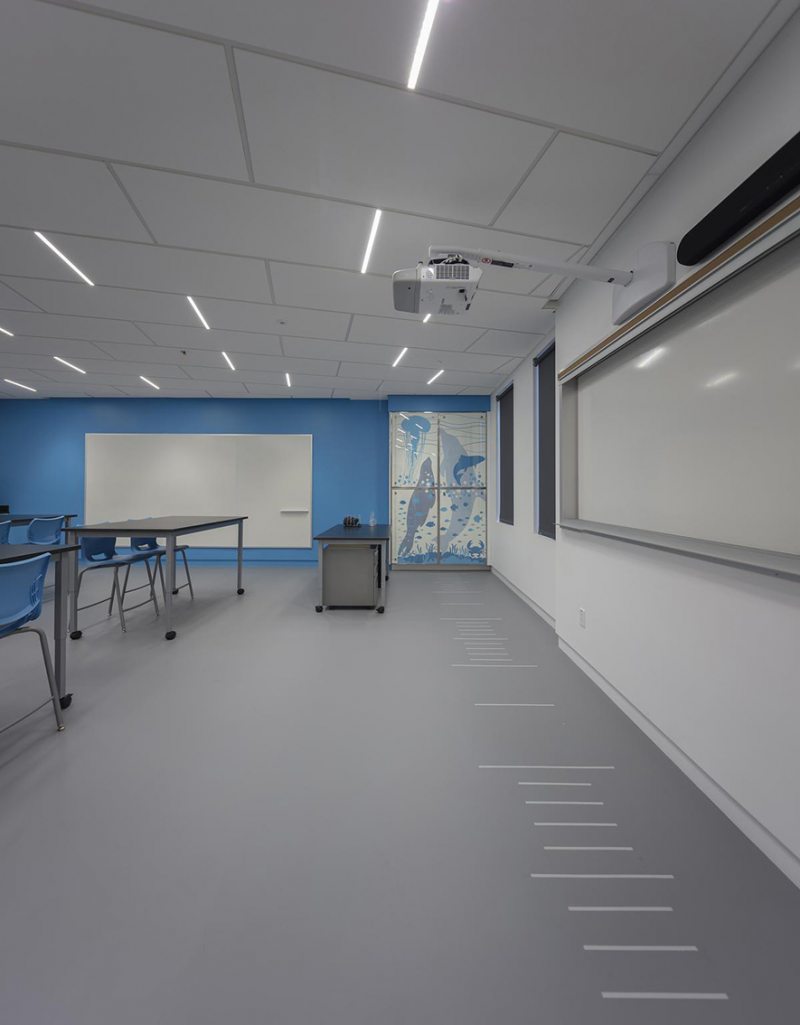 A visão para essas salas de aula era clara: fundir a função com uma estética inspirada no próprio currículo. Antes de qualquer consideração estética, o foco principal do projeto foi a funcionalidade. A equipe reconheceu que as salas de aula de ciências do ensino médio exigiam um ambiente prático e adaptável. Isso se traduziu em uma série de características de design cuidadosamente planejadas.