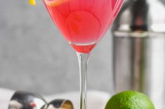 Bata tudo na coqueteleira com gelo, coe e sirva em taça de martini.