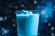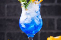 Bata com gelo e sirva em copo baixo, decorado com cristais de açúcar azul.