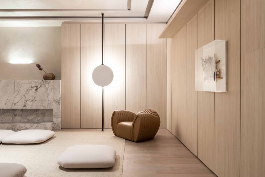 O piso estruturado de Carvalho Stone, fornecido pela Base Sólida, foi utilizado em todo o ambiente e combinado a uma lareira de pedra natural e mobiliário de linhas orgânicas distribuídos ao redor do tapete de rattan. A iluminação indireta acolhedora e os objetos decorativos que remetem à natureza completaram o espaço. A julgar a longa história do estilo Japandi e sua capacidade de permanecer relevante, este estilo continuará entre as tendências de décor por muito tempo.