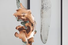 Decorar com peças únicas e autênticas entrega uma alma especial aos espaços e, nessa sala de estar, o destaque se direciona para a escultura de bronze patinado, de Sonia Ebling, e ao fundo, a tela de Tikashi Fukushima atrai olhares curiosos | Projeto do escritório Korman Arquitetos | Foto: Gui Morelli
