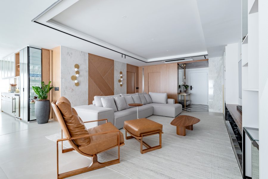 A área social orienta a proposta. O layout privilegia espaços conectados para convivência. Painéis em marmoraria revestem paredes, e o piso em porcelanato 80 × 160 contribui para a leitura contínua dos ambientes. O mobiliário inclui peças assinadas por designers brasileiros, como a Poltrona Eixo, de Rejane Carvalho Leite, as cadeiras BEC, de Luan Dal Sálvio, e poltronas giratórias de Pepe Lima.