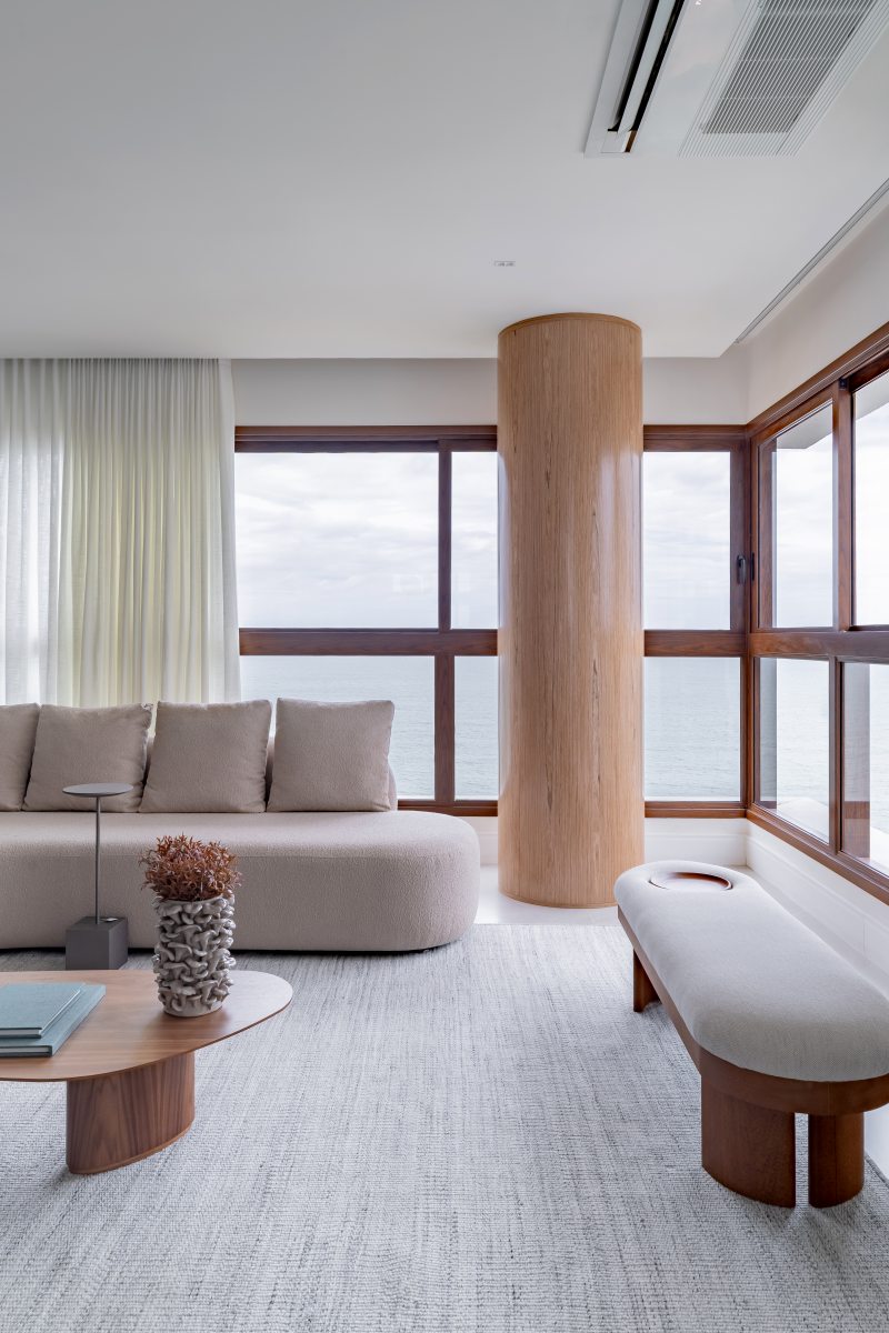 Adquirido ainda na planta por um casal de empresários em busca de um refúgio à beira-mar, o apartamento passou por um acompanhamento fase a fase durante projeto e obra. Esse processo permitiu ajustes estratégicos em pontos elétricos, hidráulicos, climatização, gás e forro, além de viabilizar uma mudança importante na planta original: das quatro suítes previstas, permaneceram duas, enquanto as demais deram lugar a um home office, ampliando a área social e favorecendo a integração dos ambientes.