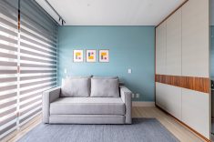 O home office foi concebido como espaço multifuncional, reunindo estante, armários planejados e sofá-cama, podendo acomodar hóspedes quando necessário.