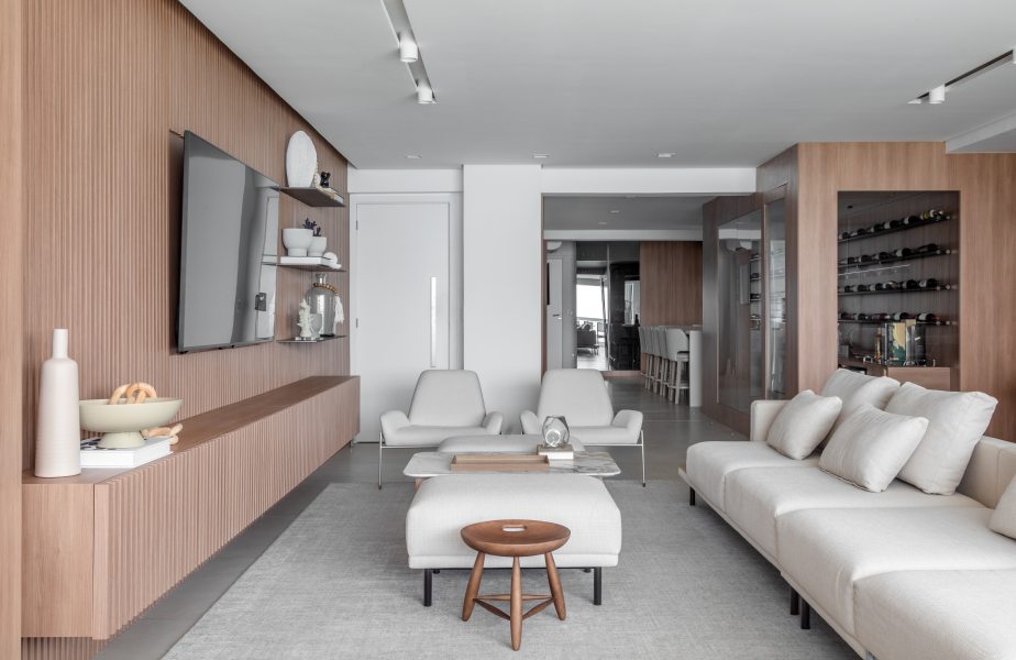 Onde: Curitiba • 05 de Setembro - 2023 | Fotos Fábio Jr. SeveroO espaçoso apartamento de frente para o mar foi decorado com peças de grande porte e soluções que priorizam a convivência familiar